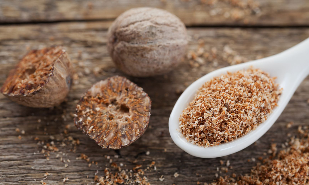 Nutmeg or Myristica fragrance is an evergreen tree indigenous to Indonesia. The fruit of the tree is the source of two different spices – nutmeg and mace. The nutmeg seed is encased in a mottled yellow, edible fruit, the approximate size and shape of a small peach. The fruit splits in half to reveal a net-like, bright red covering over the seed. Nutmeg is slightly sweeter while mace has a more delicate flavour. Mace is often preferred in light dishes for the bright orange, saffron-like hue it imparts, while nutmeg is used when a stronger flavour is required, such as cheese sauces.